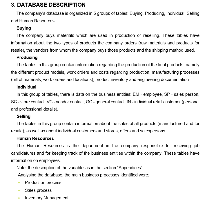 Data: Groups were given a relational database and flat files, containing data from a fictional company. This data consisted in company products, employees, customer and sales information.