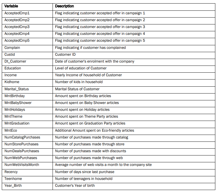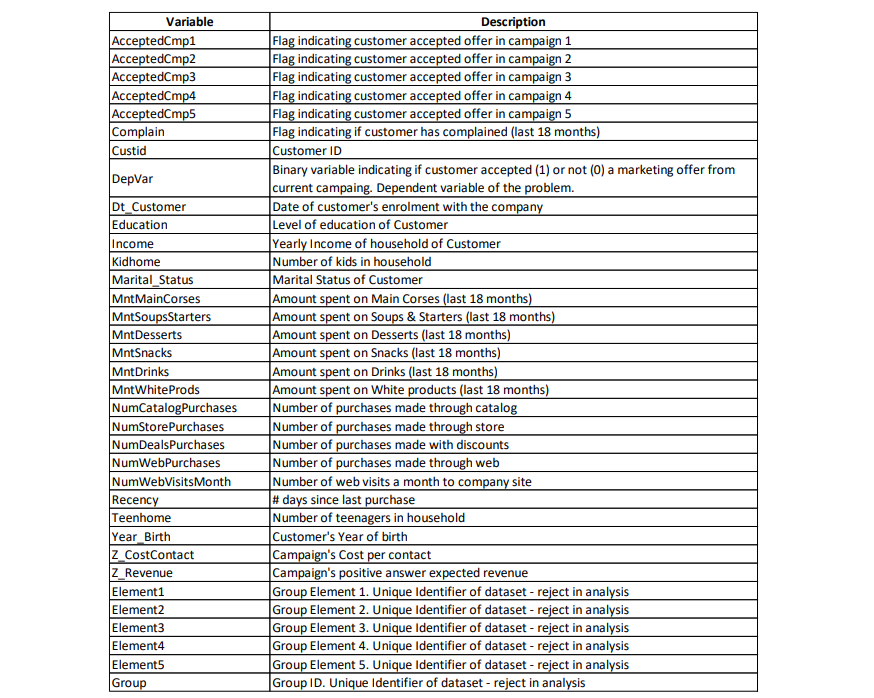 Data: Groups were given a dataset containing variables related with client information and their acquisitions of company products.