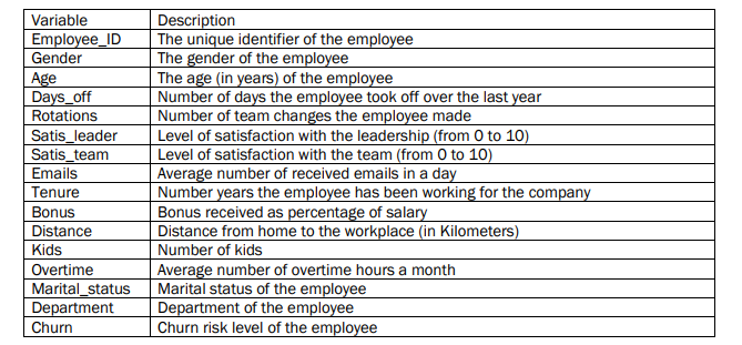 Data: Groups were given a dataset containing employee information and their churn risk as “low”, “medium” or “high”.